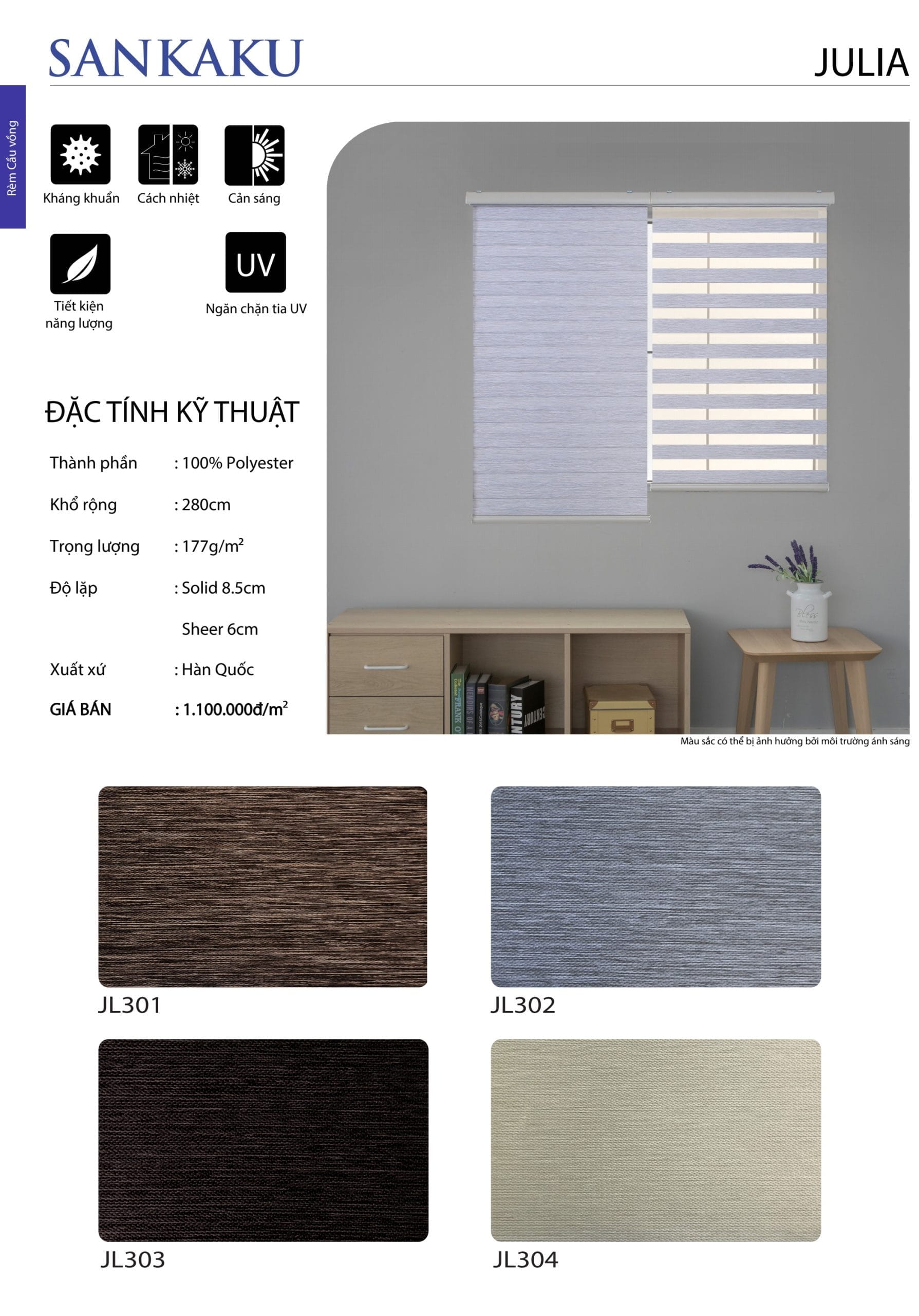Rèm cầu vồng Sankaku JULIA là lựa chọn không thể bỏ qua cho những ai đề cao sự riêng tư, hiệu quả cản sáng và vẻ đẹp tinh tế. Với chất lượng vượt trội từ Hàn Quốc, cùng các tính năng thông minh và bảng màu vân sợi độc đáo, JULIA không chỉ là một sản phẩm, mà là một khoản đầu tư xứng đáng cho sự hoàn mỹ của ngôi nhà bạn.
